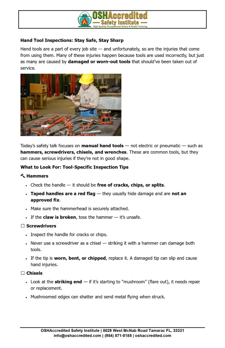 A quick inspection before using a hand tool can prevent serious injuries. If a tool is damaged, tag it, report it, and replace it. And remember — tools are there to make your job safer and easier, but only if they’re in good condition.